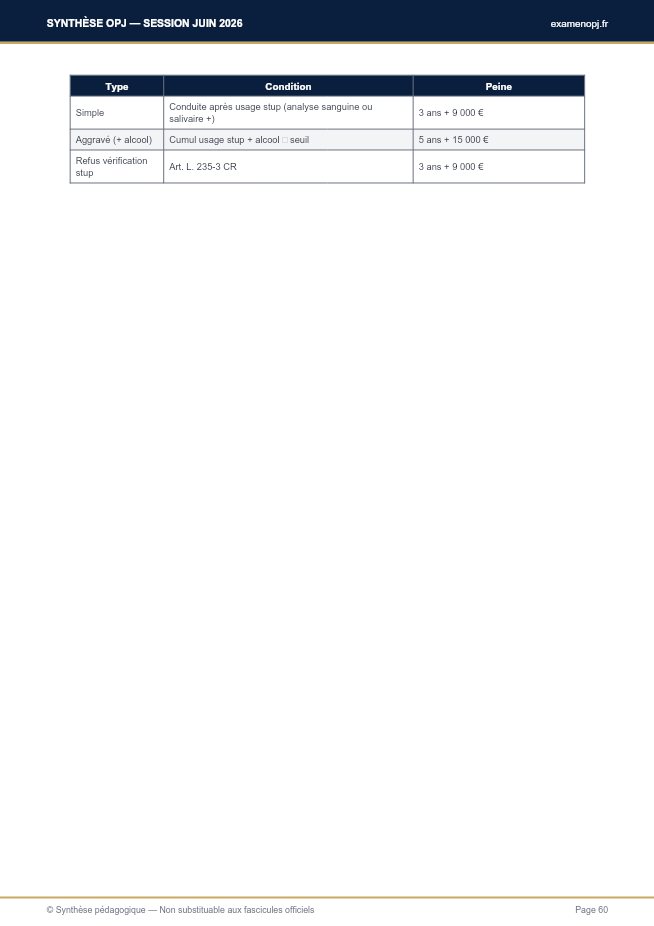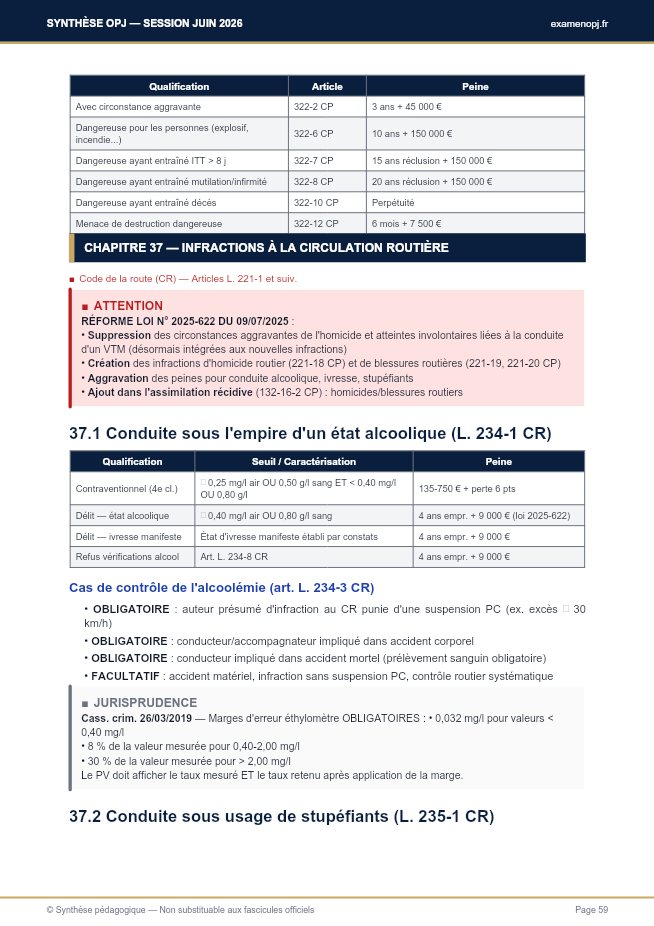 Qualification Seuil / Caractérisation Peine Contraventionnel (4e cl.) ≥ 0,25 mg/l air OU 0,50 g/l sang ET < 0,40 mg/l OU 0,80 g/l 135-750 € + perte 6 pts Délit — état alcoolique ≥ 0,40 mg/l air OU 0,80 g/l sang 4 ans empr. + 9 000 € (loi 2025-622) Délit — ivresse manifeste État d'ivresse manifeste établi par constats 4 ans empr. + 9 000 € Refus vérifications alcool Art. L. 234-8 CR 4 ans empr. + 9 000 € Cas de contrôle de l'alcoolémie (art. L. 234-3 CR) • OBLIGATOIRE: auteur présumé d'infraction au CR punie d'une suspension PC (ex. excès ≥ 30 km/h) • OBLIGATOIRE: conducteur/accompagnateur impliqué dans accident corporel • OBLIGATOIRE: conducteur impliqué dans accident mortel (prélèvement sanguin obligatoire) • FACULTATIF: accident matériel, infraction sans suspension PC, contrôle routier systématique