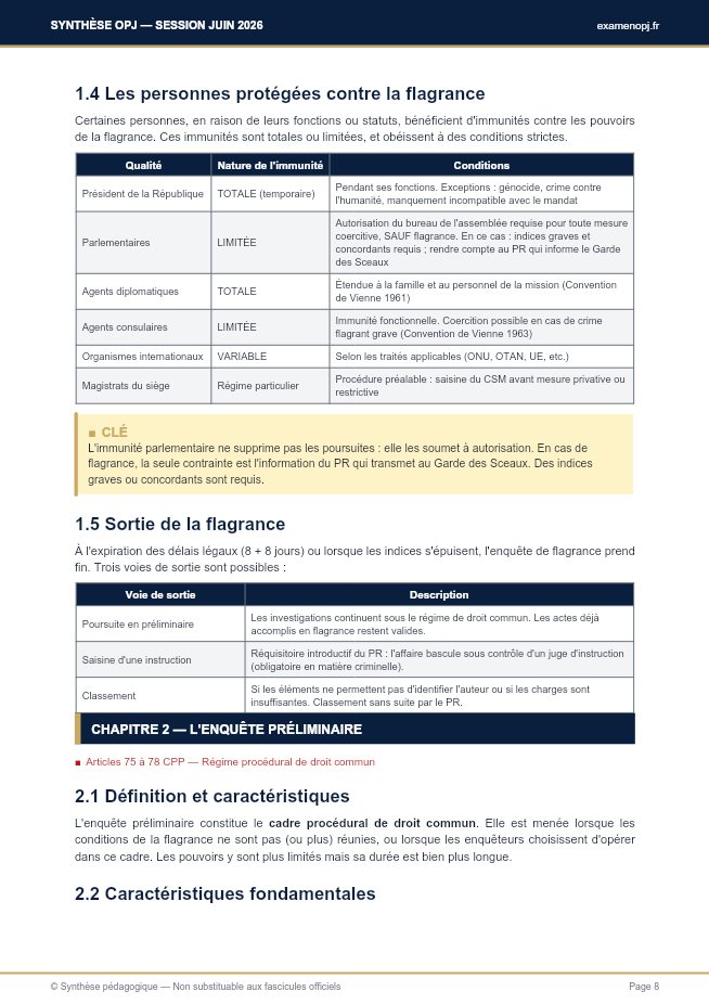 ASTUCE JURY Jury OPJ — savoir justifier son choix: en cas de doute, préférer le cadre préliminaire, plus solide juridiquement, quitte à basculer en flagrance si des indices apparents se révèlent. L'inverse — flagrance contestable suivie de bascule en préliminaire — expose à des nullités en chaîne.