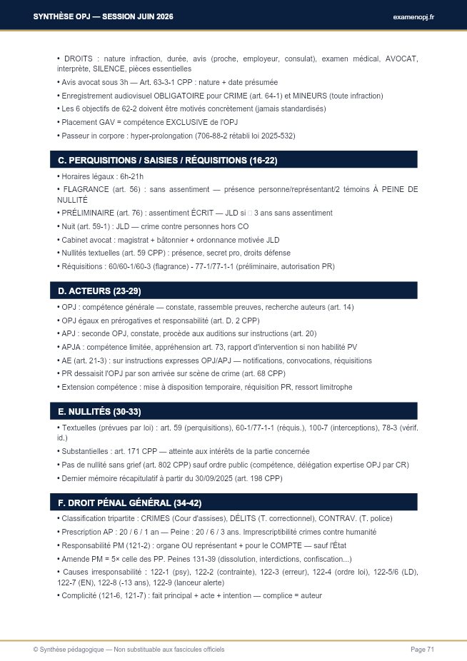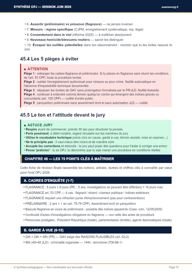 CONCLUSION Un mot pour finir Tu tiens entre les mains une synthèse dense mais structurée du programme complet de l'examen OPJ session juin 2026. Elle intègre les dernières évolutions législatives de 2025 — toutes majeures — et couvre l'ensemble des fascicules officiels SDCP/DOCPRO dans leur version mise à jour au 1er décembre 2025. Ne cherche pas à tout mémoriser d'un coup. Travaille par parties en suivant le plan proposé. Commence par les cadres d'enquête (partie I) et les mesures de contrainte (partie II) — ce sont les fondations procédurales. Consolide ensuite la phase juridictionnelle (III) et le droit pénal général (IV). Puis attaque les infractions spéciales (V) par grandes thématiques (personnes, biens, routier, stups, armes, mineurs, nation). Termine par l'actualisation 2025 et la fiche des 70 points clés (VI). Entraîne-toi à l'oral avec la trame en 3 temps (chapeau / déroulé / suites). Simule des affaires avec des camarades ou ton trainer. Chronomètre tes exposés. Cible les sujets les plus probables: violences aggravées, vol avec arme, conduite sous alcool/stup, trafic stupéfiants, viol (réforme 2025), agressions sur mineurs, délits routiers nouveaux, criminalité organisée. Le jour J, fais confiance à ta préparation. Respire. Prends 30 secondes pour structurer ta pensée avant de parler. Ne te précipite pas — un exposé structuré et posé vaut mieux qu'une récitation hachée. Cite les articles avec précision. Rappelle systématiquement les durées-clés (24h GAV, 3h avis avocat, 8 jours flagrance...). Si tu hésites, ne t'invente pas une règle: dis que tu vérifierais, c'est professionnel.