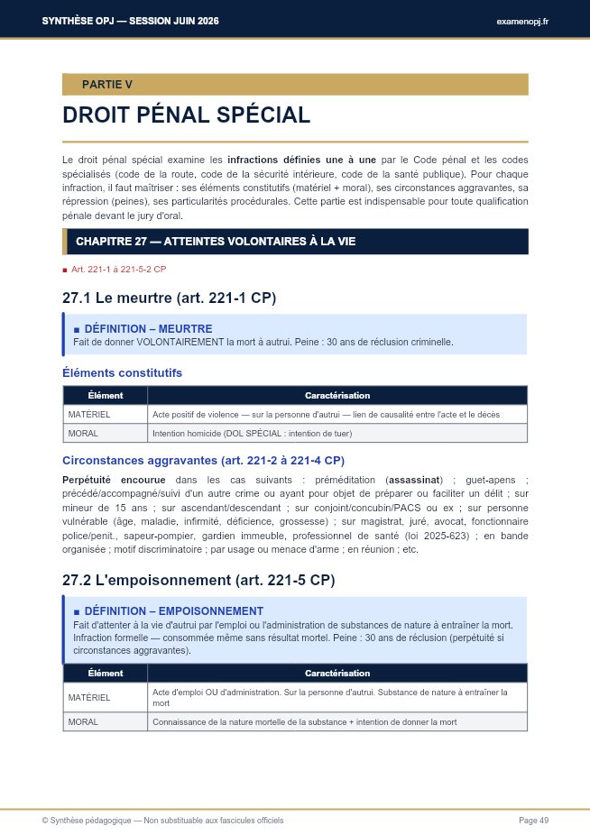 DÉFINITION – MEURTRE Fait de donner VOLONTAIREMENT la mort à autrui. Peine: 30 ans de réclusion criminelle. Éléments constitutifs Élément Caractérisation MATÉRIEL Acte positif de violence — sur la personne d'autrui — lien de causalité entre l'acte et le décès MORAL Intention homicide (DOL SPÉCIAL: intention de tuer) Circonstances aggravantes (art. 221-2 à 221-4 CP) Perpétuité encourue dans les cas suivants: préméditation (assassinat); guet-apens; précédé/accompagné/suivi d'un autre crime ou ayant pour objet de préparer ou faciliter un délit; sur mineur de 15 ans; sur ascendant/descendant; sur conjoint/concubin/PACS ou ex; sur personne vulnérable (âge, maladie, infirmité, déficience, grossesse); sur magistrat, juré, avocat, fonctionnaire police/penit., sapeur-pompier, gardien immeuble, professionnel de santé (loi 2025-623); en bande organisée; motif discriminatoire; par usage ou menace d'arme; en réunion; etc.
