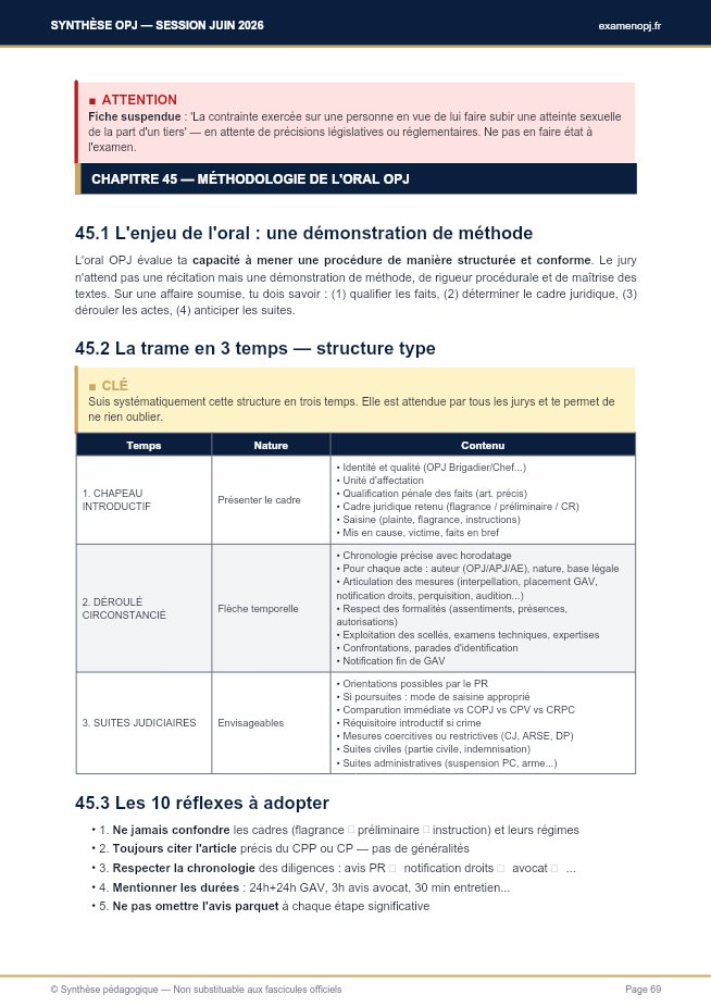 CLÉ Suis systématiquement cette structure en trois temps. Elle est attendue par tous les jurys et te permet de ne rien oublier. Temps Nature Contenu 1. CHAPEAU INTRODUCTIF Présenter le cadre • Identité et qualité (OPJ Brigadier/Chef...) • Unité d'affectation • Qualification pénale des faits (art. précis) • Cadre juridique retenu (flagrance / préliminaire / CR) • Saisine (plainte, flagrance, instructions) • Mis en cause, victime, faits en bref 2. DÉROULÉ CIRCONSTANCIÉ Flèche temporelle • Chronologie précise avec horodatage • Pour chaque acte: auteur (OPJ/APJ/AE), nature, base légale • Articulation des mesures (interpellation, placement GAV, notification droits, perquisition, audition...) • Respect des formalités (assentiments, présences, autorisations) • Exploitation des scellés, examens techniques, expertises • Confrontations, parades d'identification • Notification fin de GAV 3. SUITES JUDICIAIRES Envisageables • Orientations possibles par le PR • Si poursuites: mode de saisine approprié • Comparution immédiate vs COPJ vs CPV vs CRPC • Réquisitoire introductif si crime • Mesures coercitives ou restrictives (CJ, ARSE, DP) • Suites civiles (partie civile, indemnisation) • Suites administratives (suspension PC, arme...)