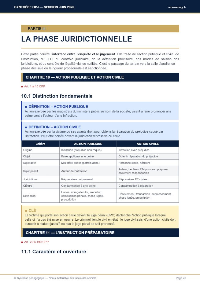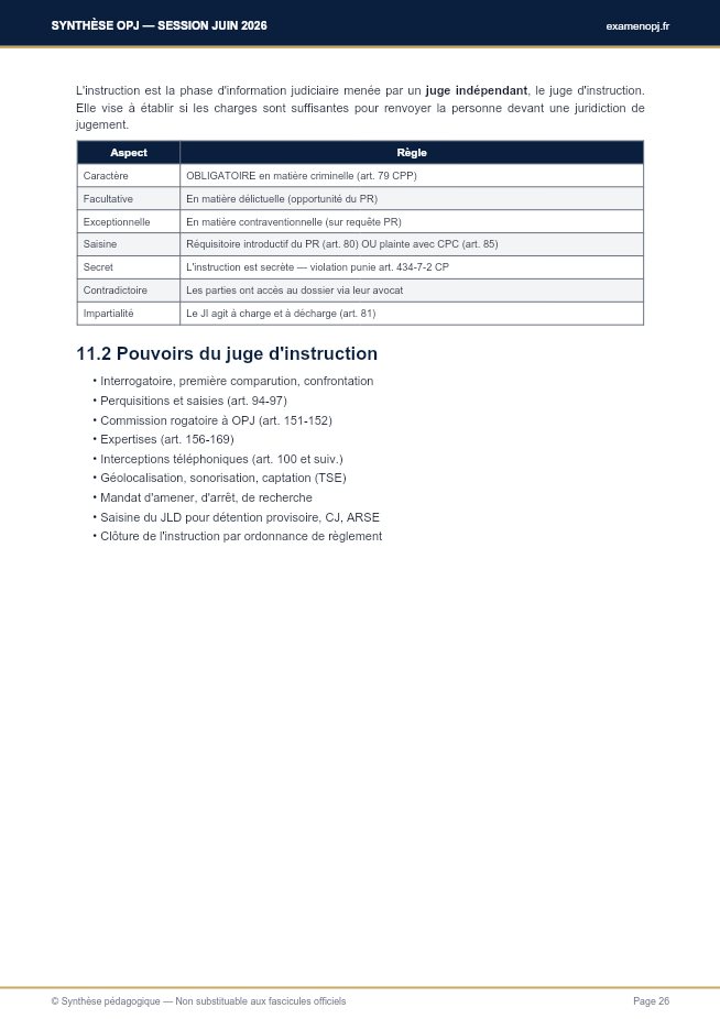 L'instruction est la phase d'information judiciaire menée par un juge indépendant, le juge d'instruction. Elle vise à établir si les charges sont suffisantes pour renvoyer la personne devant une juridiction de jugement. Aspect Règle Caractère OBLIGATOIRE en matière criminelle (art. 79 CPP) Facultative En matière délictuelle (opportunité du PR) Exceptionnelle En matière contraventionnelle (sur requête PR) Saisine Réquisitoire introductif du PR (art. 80) OU plainte avec CPC (art. 85) Secret L'instruction est secrète — violation punie art. 434-7-2 CP Contradictoire Les parties ont accès au dossier via leur avocat Impartialité Le JI agit à charge et à décharge (art. 81)