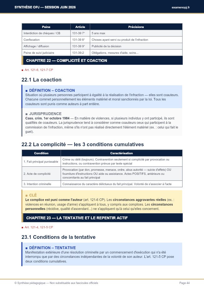 DÉFINITION – TENTATIVE Manifestation extérieure d'une résolution criminelle par un commencement d'exécution qui n'a été interrompu que par des circonstances indépendantes de la volonté de son auteur. L'art. 121-5 CP pose deux conditions cumulatives. Condition Caractérisation Commencement d'exécution Acte tendant directement à la consommation de l'infraction + volonté non équivoque. Distinction avec les actes préparatoires (non punissables) Absence de désistement volontaire L'interruption doit être due à des circonstances extérieures indépendantes de la volonté de l'auteur. Si désistement volontaire = impunité