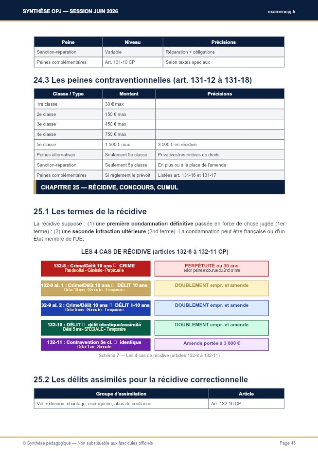 Cas de récidive Délai Conséquence 132-8: Crime/délit 10 ans → CRIME Pas de délai Perpétuité si 20/30 ans. 30 ans si 15 ans 132-9 al. 1: Crime/délit 10 ans → DÉLIT 10 ans 10 ans Doublement empr. et amende 132-9 al. 2: Crime/délit 10 ans → DÉLIT 1-10 ans 5 ans Doublement empr. et amende 132-10: DÉLIT < 10 ans → délit identique/assimilé 5 ans Doublement empr. et amende 132-11 al. 1: Contravention 5e classe identique 1 an Amende portée à 3 000 € 132-11 al. 2: Loi prévoit que récidive 5e = délit 3 ans Peines délictuelles