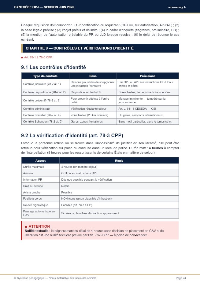 Type de contrôle Base Précisions Contrôle judiciaire (78-2 al. 1) Raisons plausibles de soupçonner une infraction / tentative Par OPJ ou APJ sur instructions OPJ. Pour crimes et délits Contrôle réquisitionné (78-2 al. 2) Réquisition écrite du PR Durée limitée, lieu et infractions spécifiés Contrôle préventif (78-2 al. 3) Pour prévenir atteinte à l'ordre public Menace imminente — tempéré par la jurisprudence Contrôle administratif Vérification régularité séjour Art. L. 611-1 CESEDA — CSI Contrôle frontalier (78-2 al. 4) Zone limitée (20 km frontière) Ou gares, aéroports internationaux Contrôle Schengen (78-2 al. 5) Gares, zones frontalières Sans motif particulier, dans le temps strict