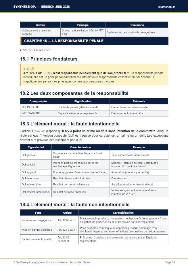 L'article 121-3 CP dispose qu'il n'y a point de crime ou délit sans intention de le commettre. Ainsi, la règle est que l'intention coupable (dol) est requise pour caractériser un crime ou un délit. Les exceptions doivent être prévues expressément par la loi. Type de dol Caractérisation Exemple Dol général Conscience du caractère illégal + volonté d'agir Tous crimes/délits intentionnels Dol spécial Intention particulière requise par la loi — résultat spécifique visé Meurtre: intention de tuer. Escroquerie: tromper. Vol: animus domini Dol aggravé Forme aggravée d'intention — préméditation Assassinat (meurtre prémédité) Dol déterminé Résultat obtenu = résultat prévu Cas standard Dol indéterminé Résultat non connu à l'avance Sanctionné selon le résultat effectif Dol praeter intentionnel Résultat dépasse l'intention Violences ayant entraîné la mort sans intention (222-7 CP)