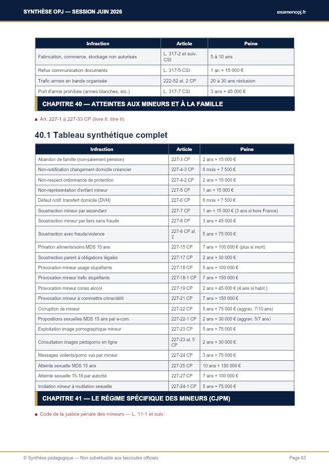 Aspect Règle Précisions GAV mineurs Régime renforcé Présence rep. légal OBLIGATOIRE. Enregistrement audiovisuel systématique. Assistance avocat obligatoire dès début GAV 13-16 ans 24h max Pas de prolongation possible GAV 16-18 ans 24h + prolongation possible Sous conditions restrictives Examen médical Obligatoire d'office Pour toute GAV de mineur Audition libre Régime adapté Notification renforcée, rep. légal avisé Juridictions Spéciales Juge des enfants, TPE, CA des mineurs Peines encourues Atténuées 13-16 ans: 1/2 max légal. 16-18 ans: atténuation facultative Mesures éducatives Privilégiées Avertissement judiciaire, liberté surveillée, placement, réparation...